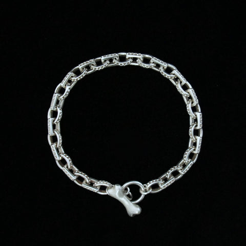 This is absolutely my newest and most favorite piece. It uses two of my favorite links, the caviat oval and caviar rectangle, joined together in one piece, and miniaturized to measure only 6MM wide. So not only is it intricate, it is very light and easy to wear by itself, and even better to layer! Hand crafted in Sterling silver. Finished with my signature "Dog Bone" clasp. It's a winner!